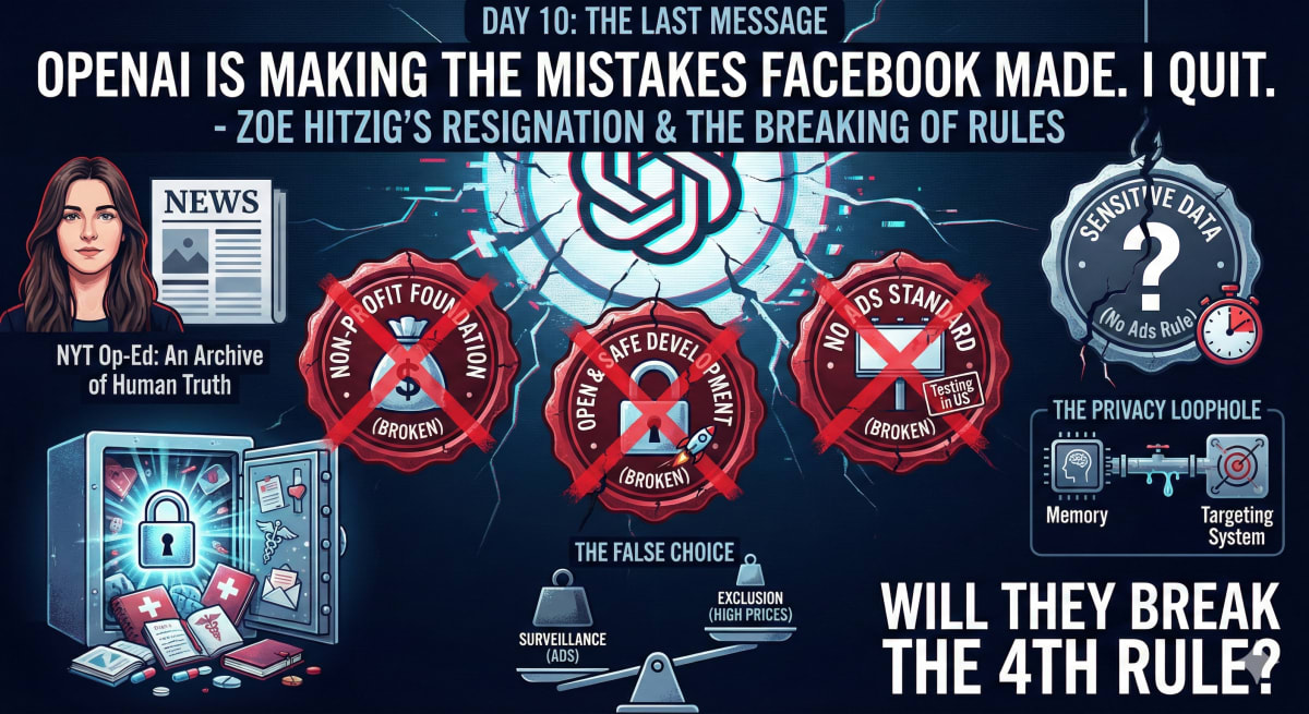 *On February 9, 2026, Zoe Hitzig, a senior researcher who spent two years shaping safety policies at OpenAI, officially resigned. On the same day, she published a serious Op-Ed in the New York Times titled: "OpenAI Is Making the Mistakes Facebook Made. I Quit." Her resignation is a major warning. It confirms that OpenAI is systematically breaking the rules it set for itself, prioritizing profit over its original mission of safety.